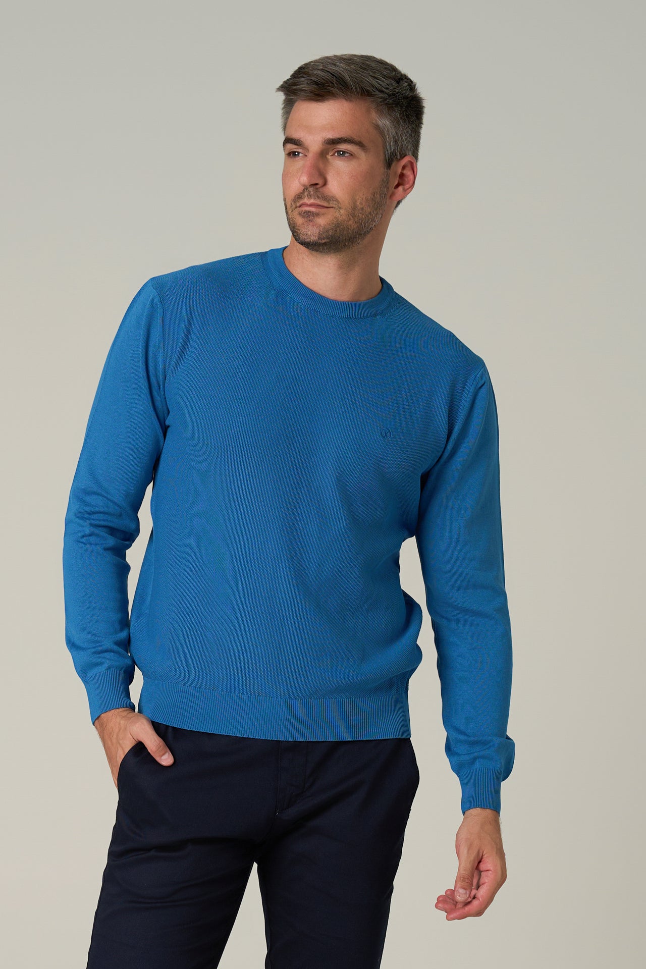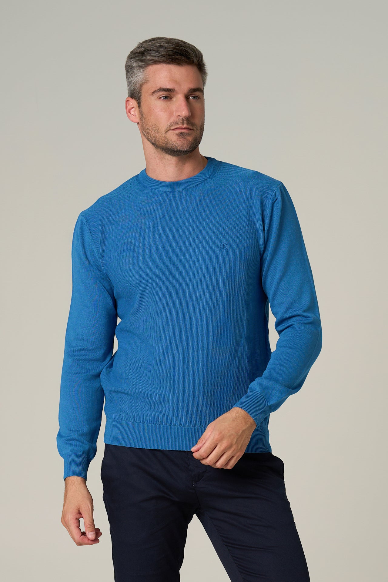 Plavi muški džemper , O izreza,sa teksturom na prednjem delu , veoma prijatan za nošenje u svakoj prilici.