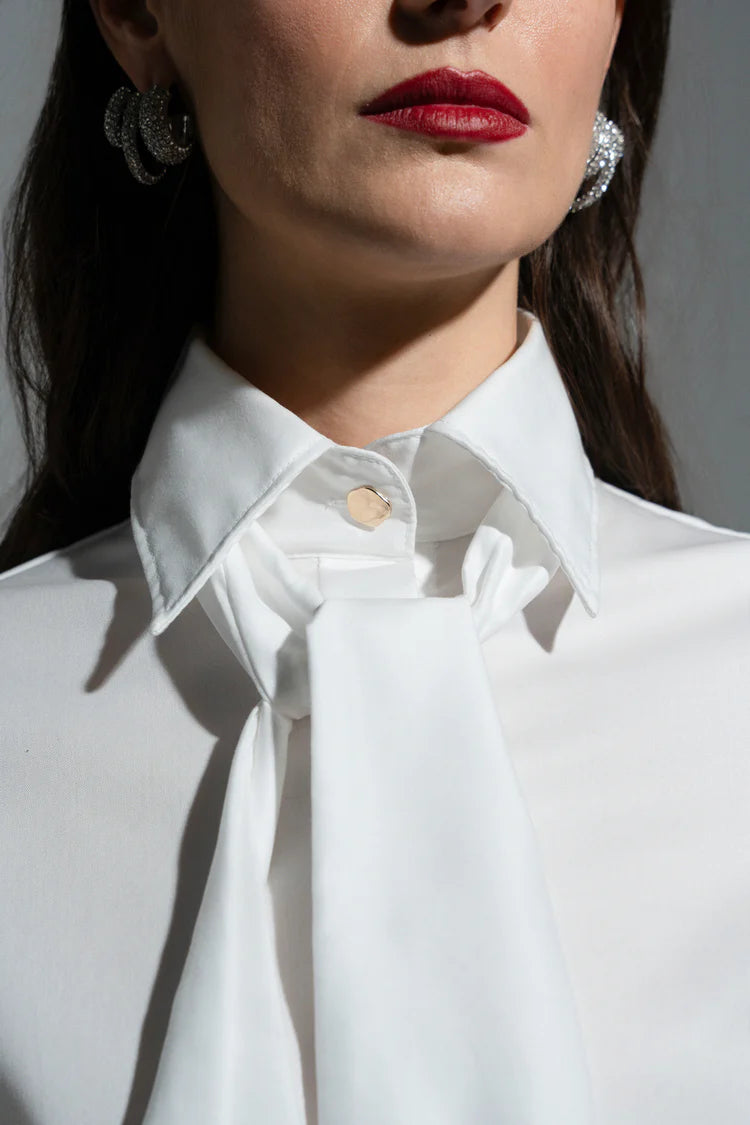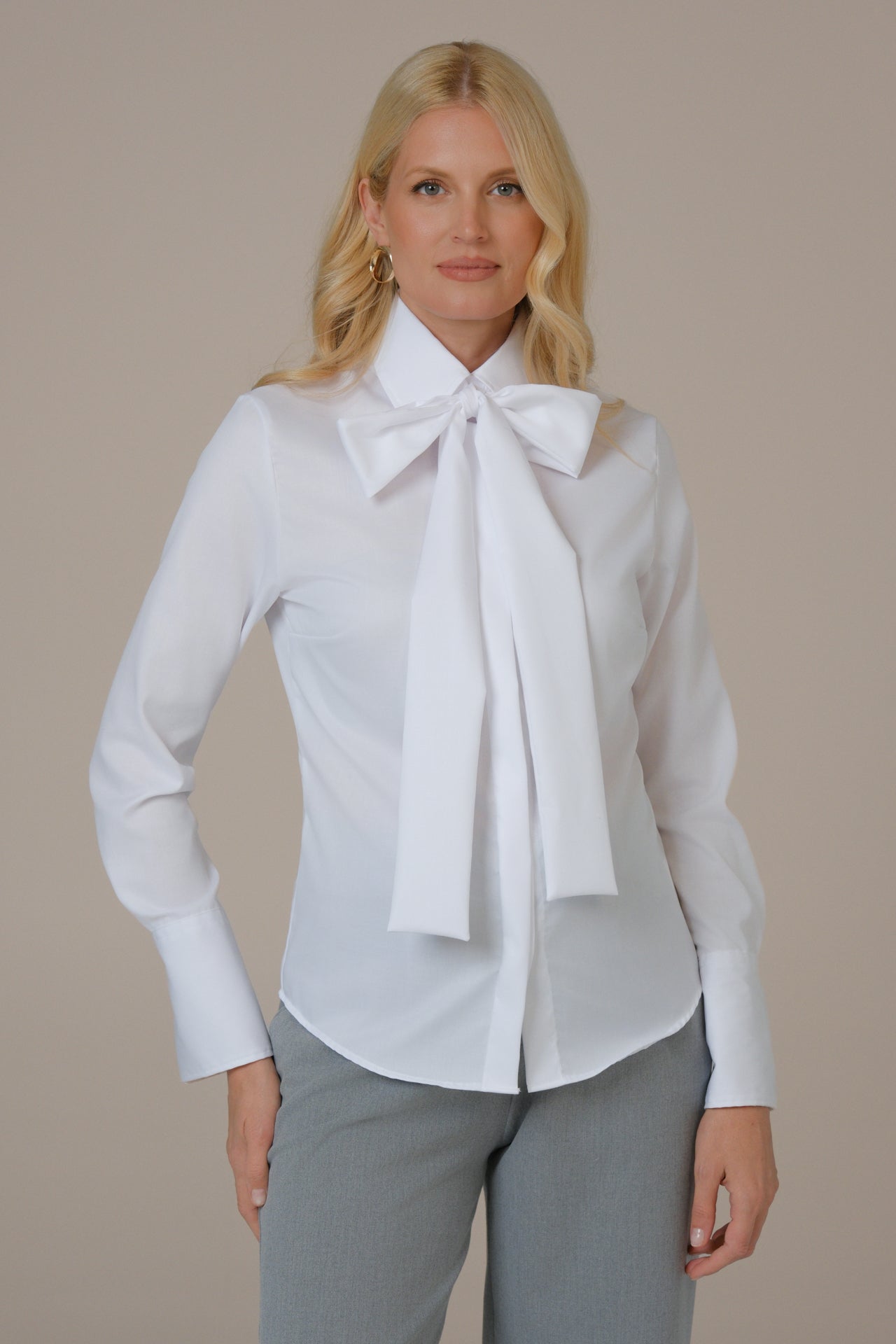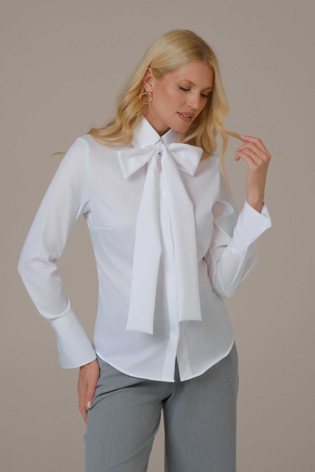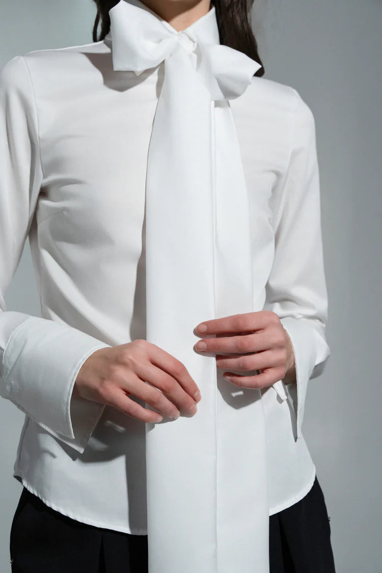 Crna ženska košulja sa mašnom. Materijal ima doradu protiv gužvanja.